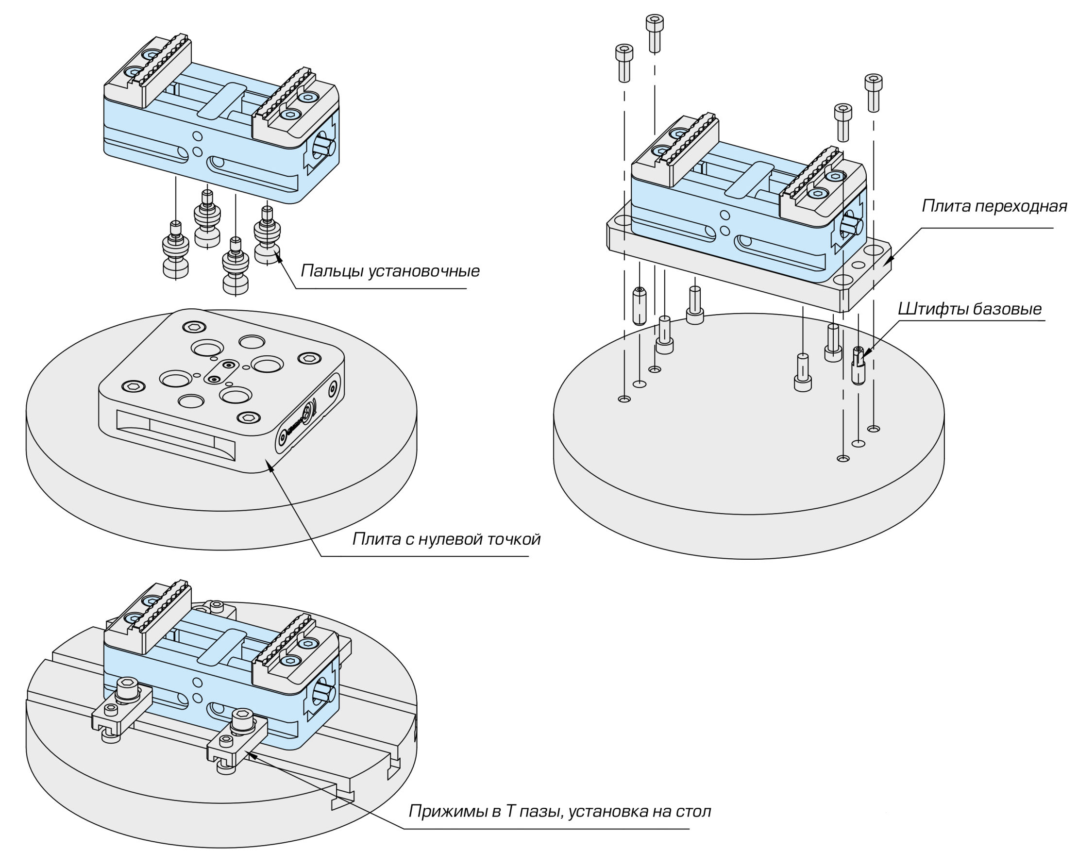Тиски имеют широкие возможности для установки в оснастку или непосредственно на стол обрабатывающего центра