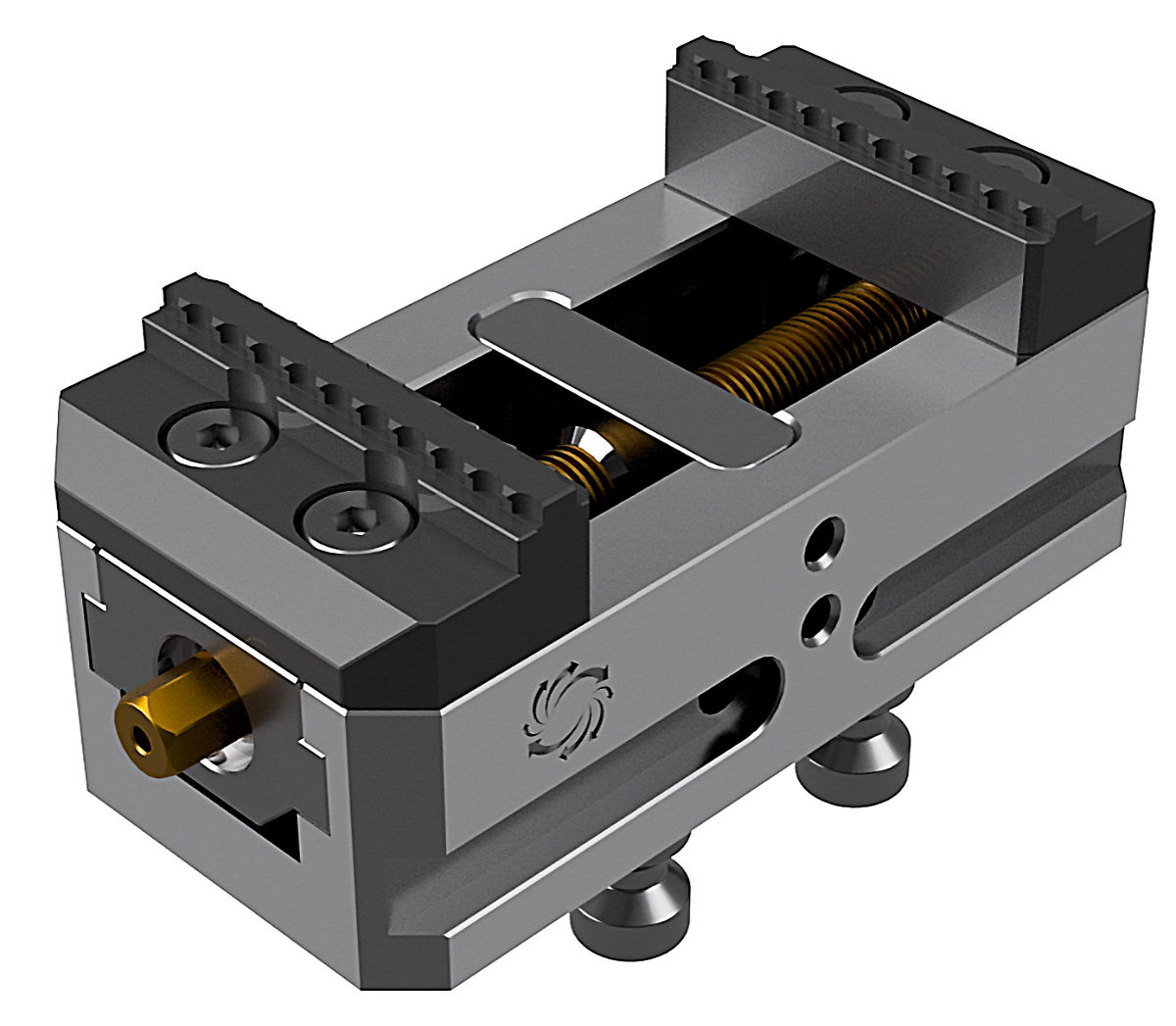 Прецизионные тиски для работы с 5 х машинными центрами и встроенной системой базирования в нулевой точке. Тиски могут быть установлены на столы обрабатывающих центров непосредственно или на мини паллеты с системой базирования в нулевой точке с комплектом дополнительных удлинителей. А так же могут быть использованы установочные башни и специальные призмы для обеспечения многоместной установки заготовок в 5 х машинные центры. Тиски имеют сменные зажимные губки с различным видом профиля: прямые, "ласточкин хвост", серрейтор, мягкие алюминиевые, стальные под обработку заказчиком, либо выполненные под профиль заказчика.
