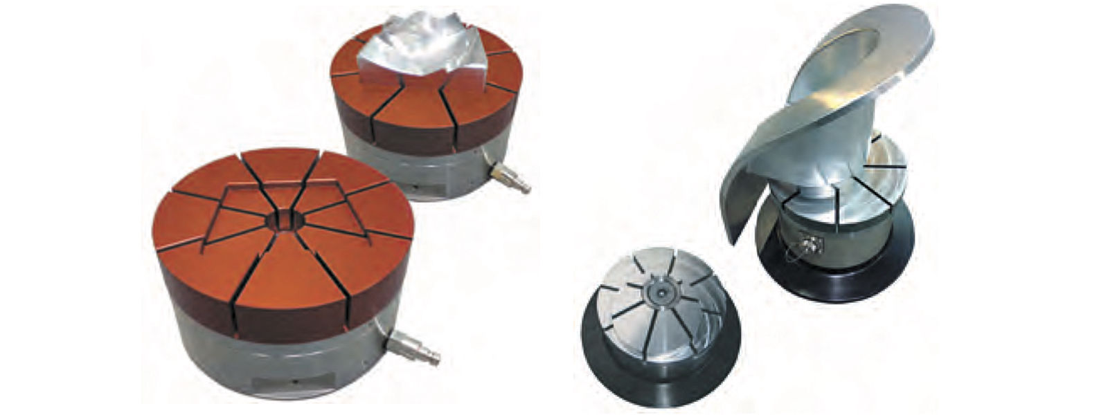 Зажим для форм подходит для установки в устройства и системы зажима данного производителя. Фланец может вместить цанговый зажим для внешнего зажима, а также цанговый зажим для внутреннего зажима. В цанговый зажим помещается контур заготовки, которую необходимо зажать. Возможны поверхности свободной формы и асимметричные контуры.