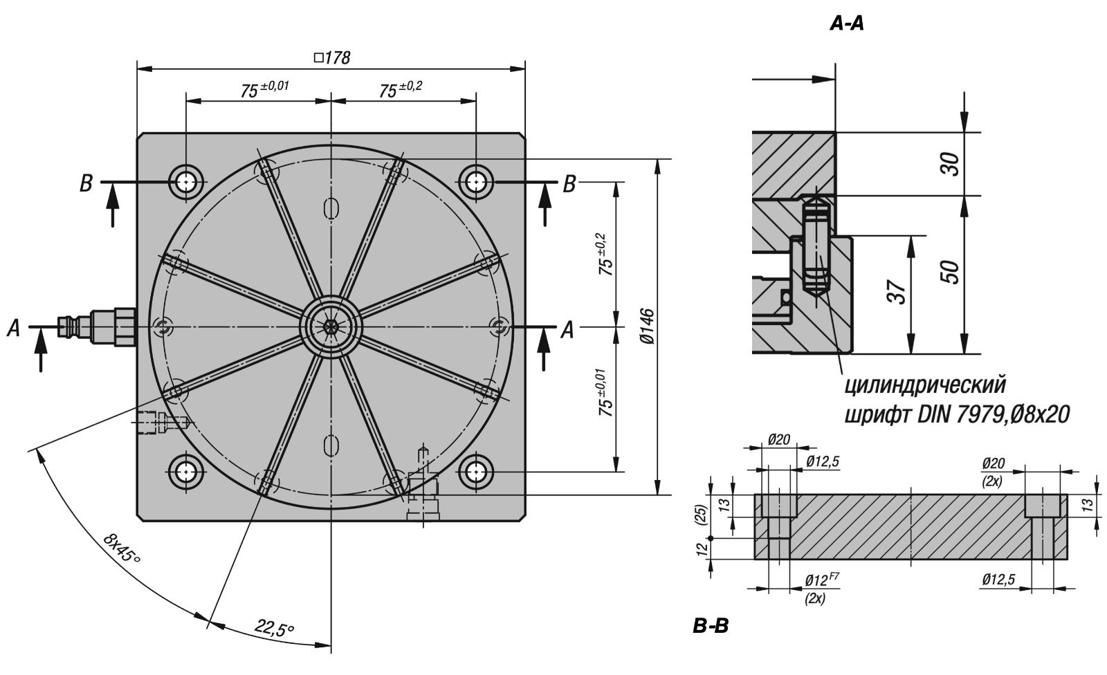Фланец, поршень и основная часть из стали. Уплотнения на основе нитрильного каучука (NBR). Болты DIN EN ISO 4762 с классом прочности не ниже 8.8. Цанговый зажим из алюминия.