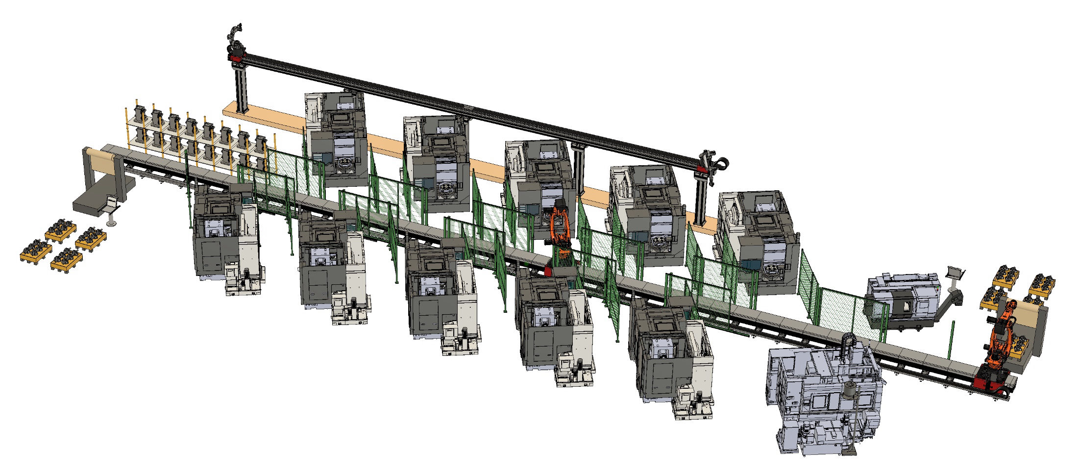 Несколько машинных центров можно установить в линию и контролировать от центрального компьютера. Это уменьшает холостые пробеги робота и упрощает логистику участка