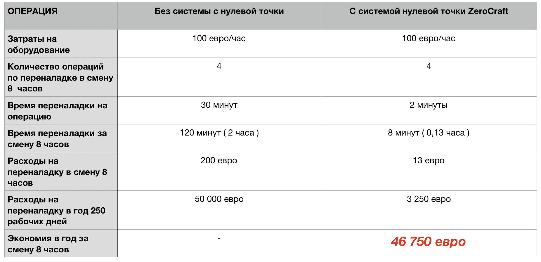 Применение систем базирования в нулевой точке обеспечивает минимальное время переналадки оборудования что дает существенную выгоду. Пример в таблице.